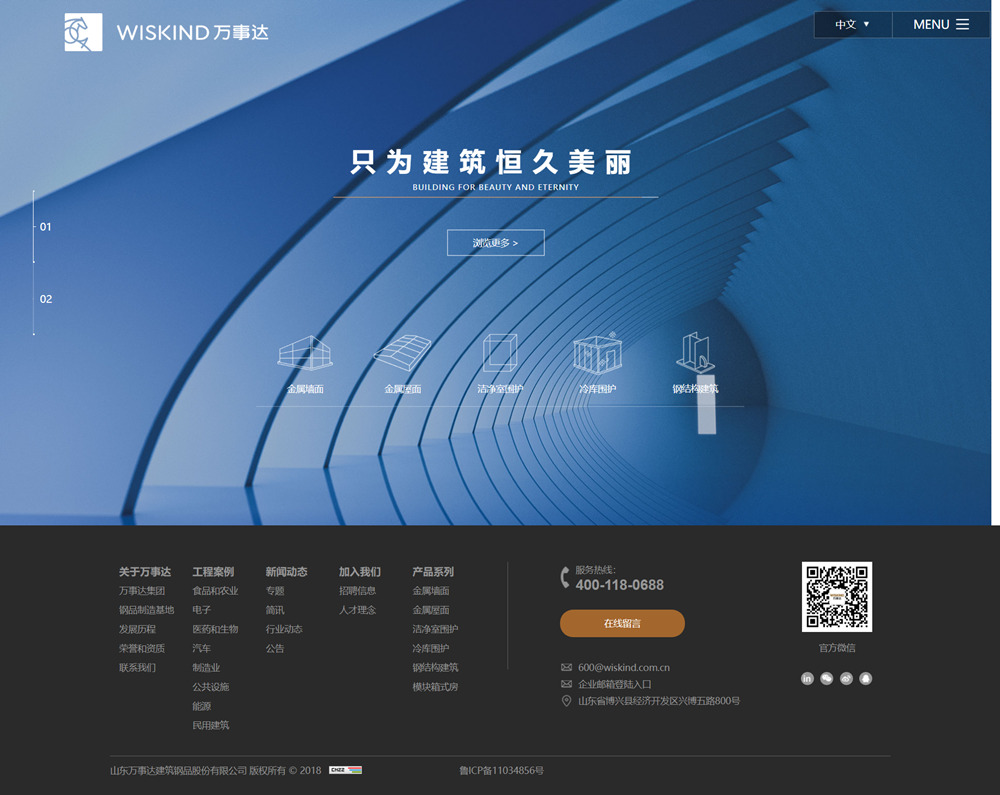 万事达集团创建于1978年,主要从事建筑钢品和冷轧钢卷制造、涂镀钢板贸易等业务。集团旗下的山东万事达建筑钢品股份有限公司,是专业的金属围护和钢结构产品制造和服务商,国家高新技术企业,2014年在新三板挂牌上市。集团总部和制造基地位于山东滨州市博兴经济开发区,占地1,000多亩。已建成投产的夹芯保温板、幕墙板、压型板、冷库板、净化板以及洁净门窗等生产线采用行业领先的设备、技术和生产管理。产品系列包括:金属外墙、金属屋面、洁净室围护、冷库围护和钢结构建筑工程等。 四十年来,万事达享誉海内外,其建筑钢品广泛应用于工业制造、物流仓储、现代农业、公共建筑、交通和商业设施等领域,为各行业的进步和发展贡献了独特的价值。万事达人始终秉承“至诚致善,相融共生”的经营理念,以精湛的技能和真诚的